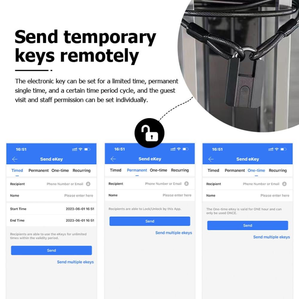 - إدارة كاملة عبر تطبيق TTLock App مع إمكانية إنشاء مفاتيح مؤقتة للضيوف أو العاملين.