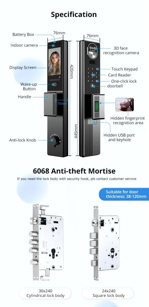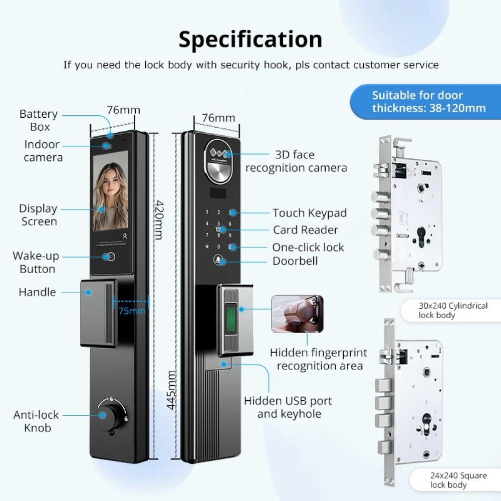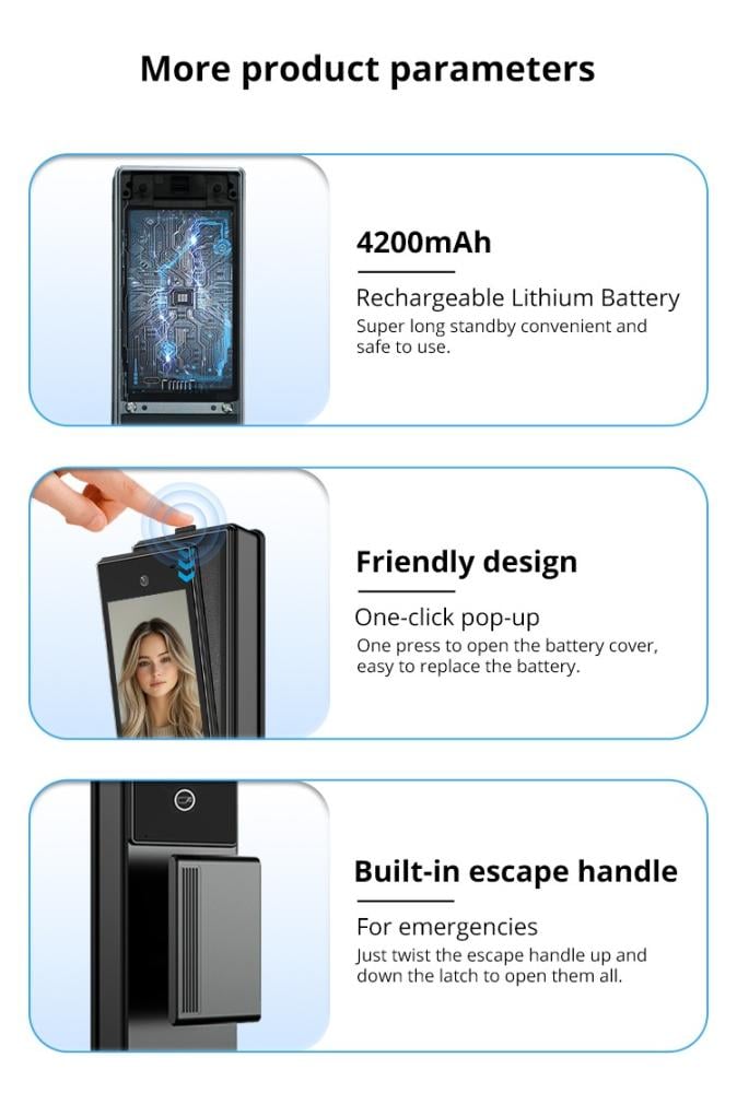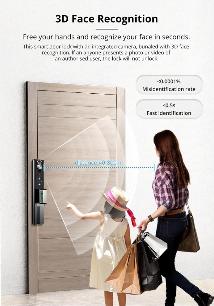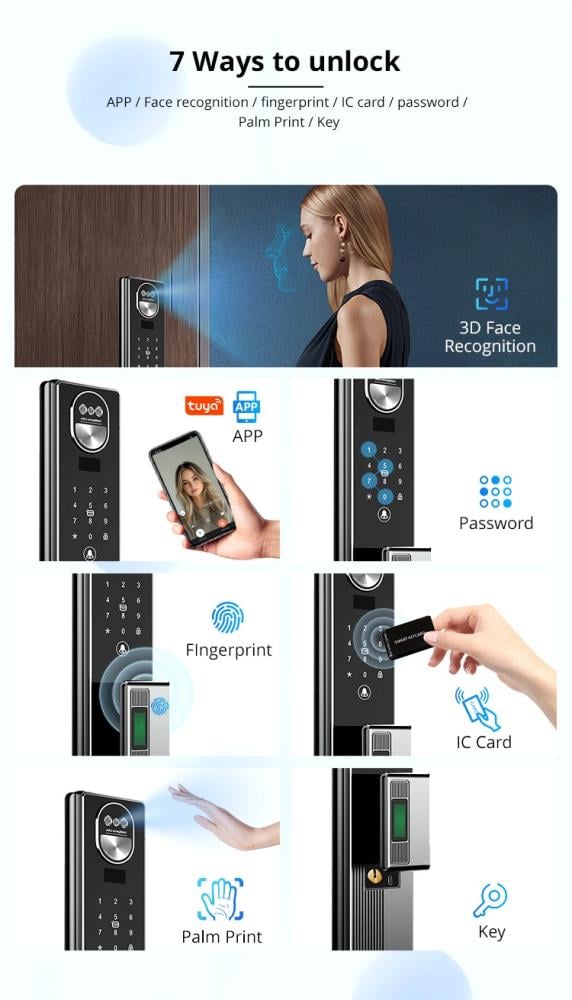 - 7 طرق فتح مختلفة: التعرف على الوجه، بصمة الإصبع، كرت ذكي، تطبيق Tuya، كلمة مرور، كف اليد، أو المفتاح الميكانيكي.