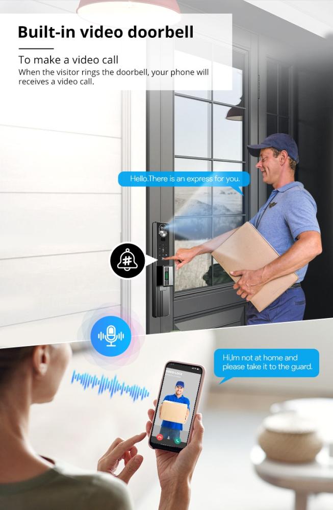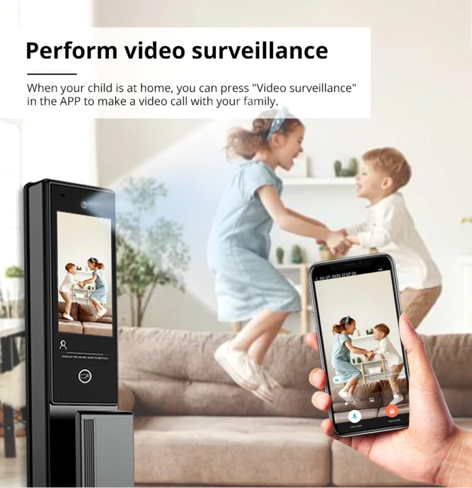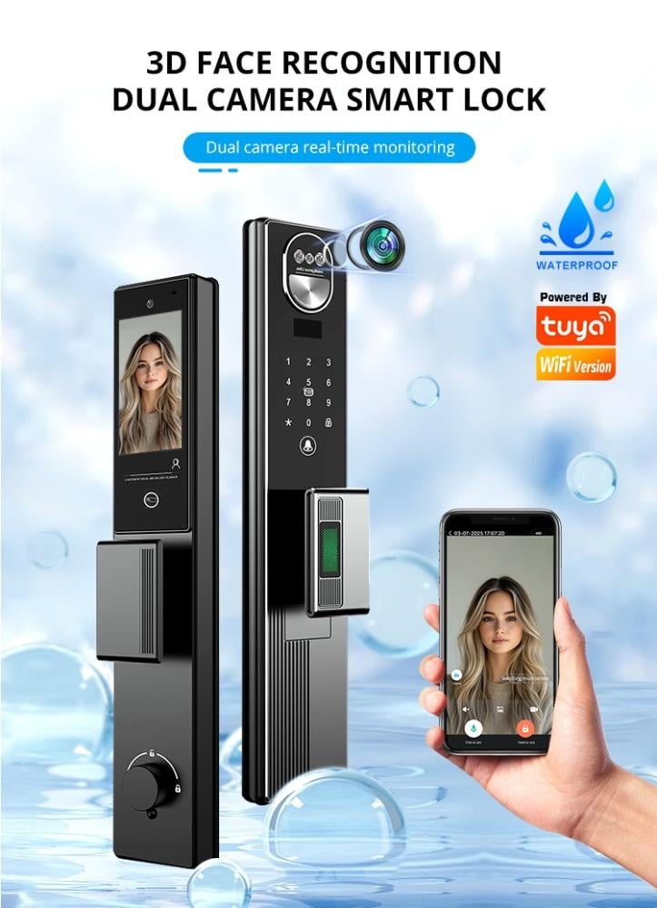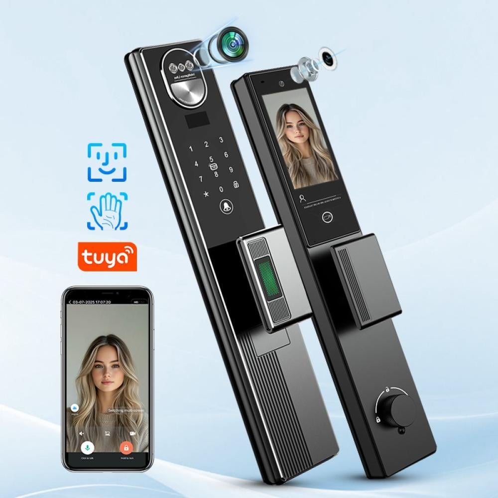 القفل يعطيك حماية عالية وتحكم كامل من جوالك عبر تطبيق Tuya، وتشوف الزوار مباشرة على شاشة 4.5 بوصة أو من خلال الجوال وقت ما يدق الجرس. تصميم أنيق، مقاوم للماء، وسهل الاستخدام سواء للبيت أو المكتب أو الفلل الحديثة.