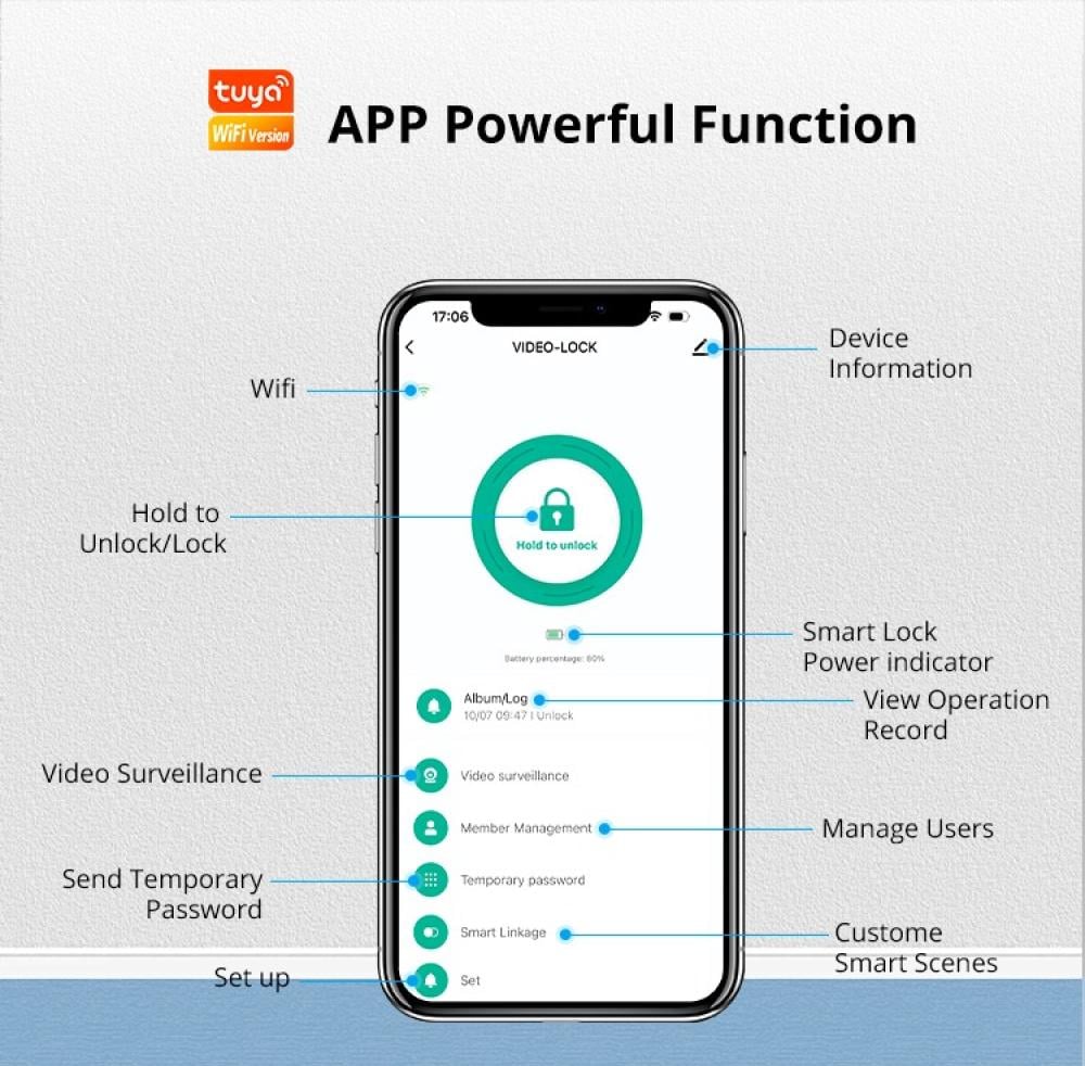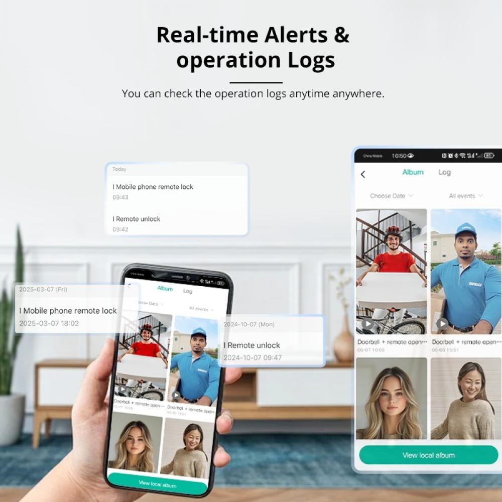 - تحكم كامل عن بُعد من خلال تطبيق WiFi Tuya (فتح الباب – عرض الكاميرا – سجل الدخول والخروج).